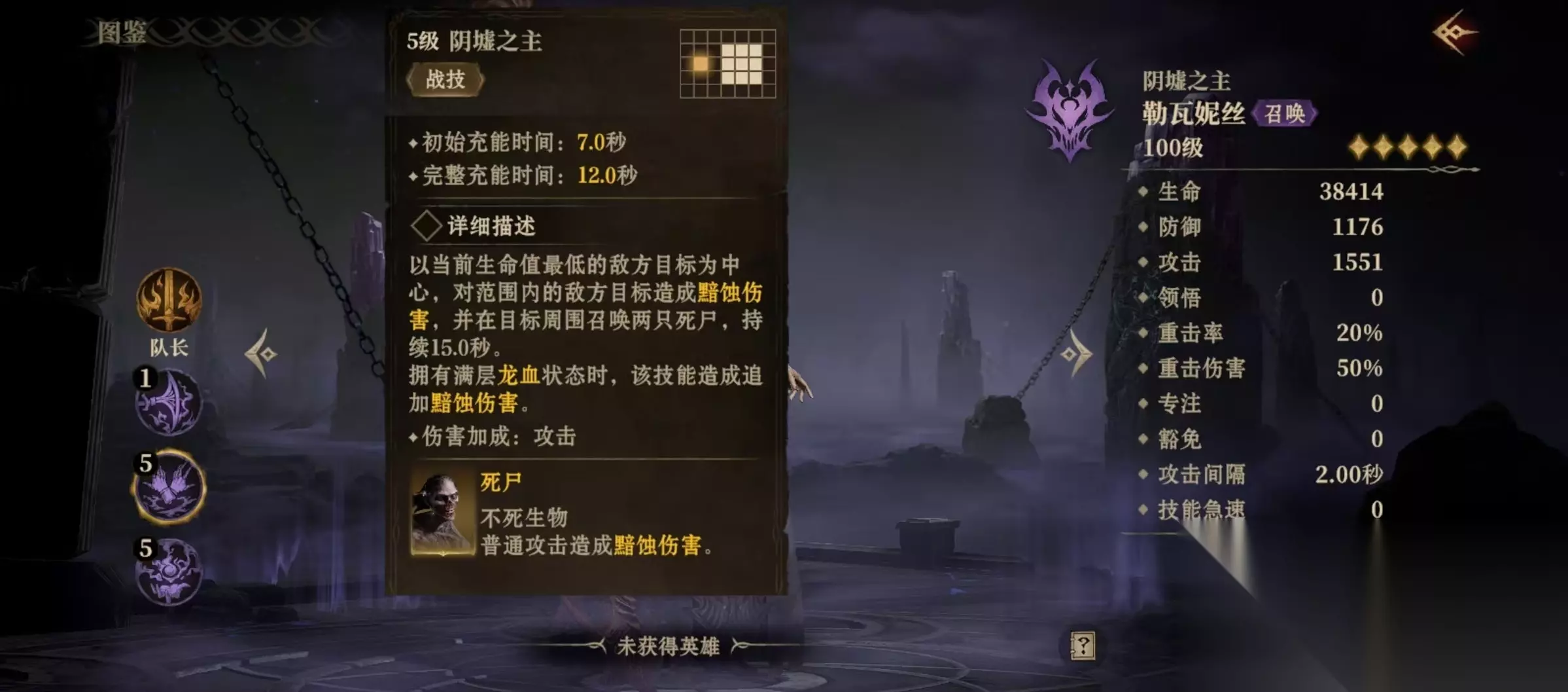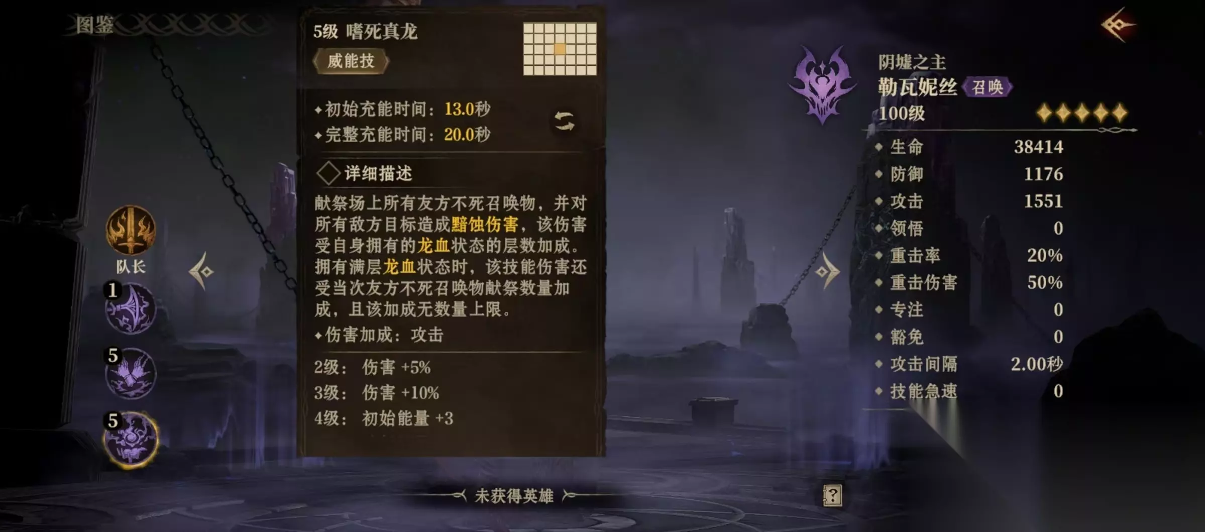 战技效果是选择对方血量最低的为目标,以其为中心造成范围伤害,并在目标周围召唤两只死尸,持续15秒钟,死尸是属于不死生物。大招嗜死真龙,将场上的所有己方的不死召唤物全部献祭掉,对敌方目标造成高额伤害,该伤害受自身拥有的龙血层数加成影响,如果拥有满层龙血,该技能伤害还能受己方不死召唤物献祭数量的加成,加成数量无上限。