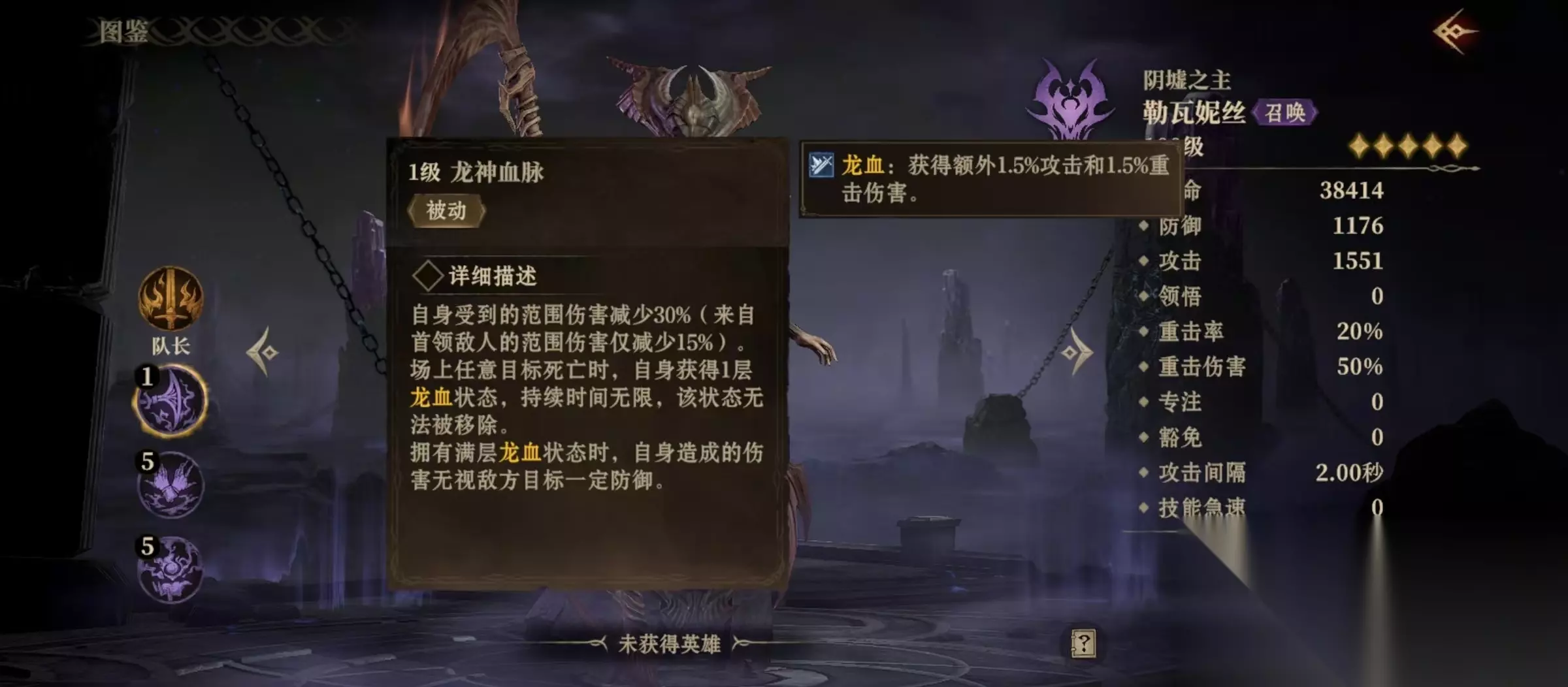 黑龙勒瓦妮丝的队长技能为重击伤害光环,只有在大角斗场中才能生效,提升所有己方单位45%重击伤害,所以是一名很适合在大角斗场中发挥威力的角色。被动减少自身受到范围伤害,当场上任意目标死亡时,都能获得一层龙血状态,持续时间无限,当叠加达到满层的时候,满层龙血的状态下,自身造成伤害可无视敌方目标的部分防御,每一层龙血能够额外提升1.5%攻击和重击伤害。