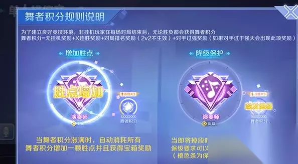 此外QQ炫舞手游排位赛每局参加的游戏玩家,还能够获取特定的舞者积分,舞者积分=无在线挂机奖品+x连胜奖品+战局排位奖品。当游戏玩家的舞者积分涨满的时候,主动损耗全部的舞者积分,增添一枚盛典并获取箱子奖品。