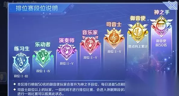 qq炫舞排位赛段位现在分为练习生、乐动者、演奏师、音乐家、司音士、御音使、神之手7个一段位。此中每一个段位下全都有多少的小分段,游戏玩家经过参加排位赛便可获取胜场,堆集胜场便可提高自身的段位。此外仅有本区排位前50的游戏玩家,次能够晋升为神之手的段位。