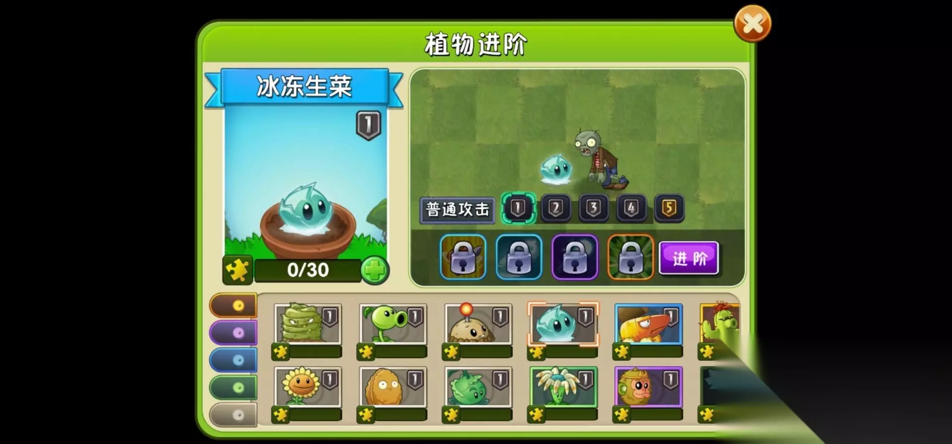 6、冰冻生菜,冻住踩到的僵尸,也可以熄灭火炬僵尸的火把,种植不用阳光,技能效果为冻住全屏僵尸。