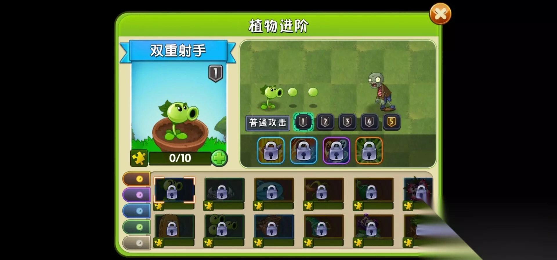 10、双重射手,每次可以向前发射两颗豌豆对僵尸造成伤害,种植需要花费200阳光,技能效果为向前方发射大量豌豆后会发射一颗巨型豌豆造成伤害。