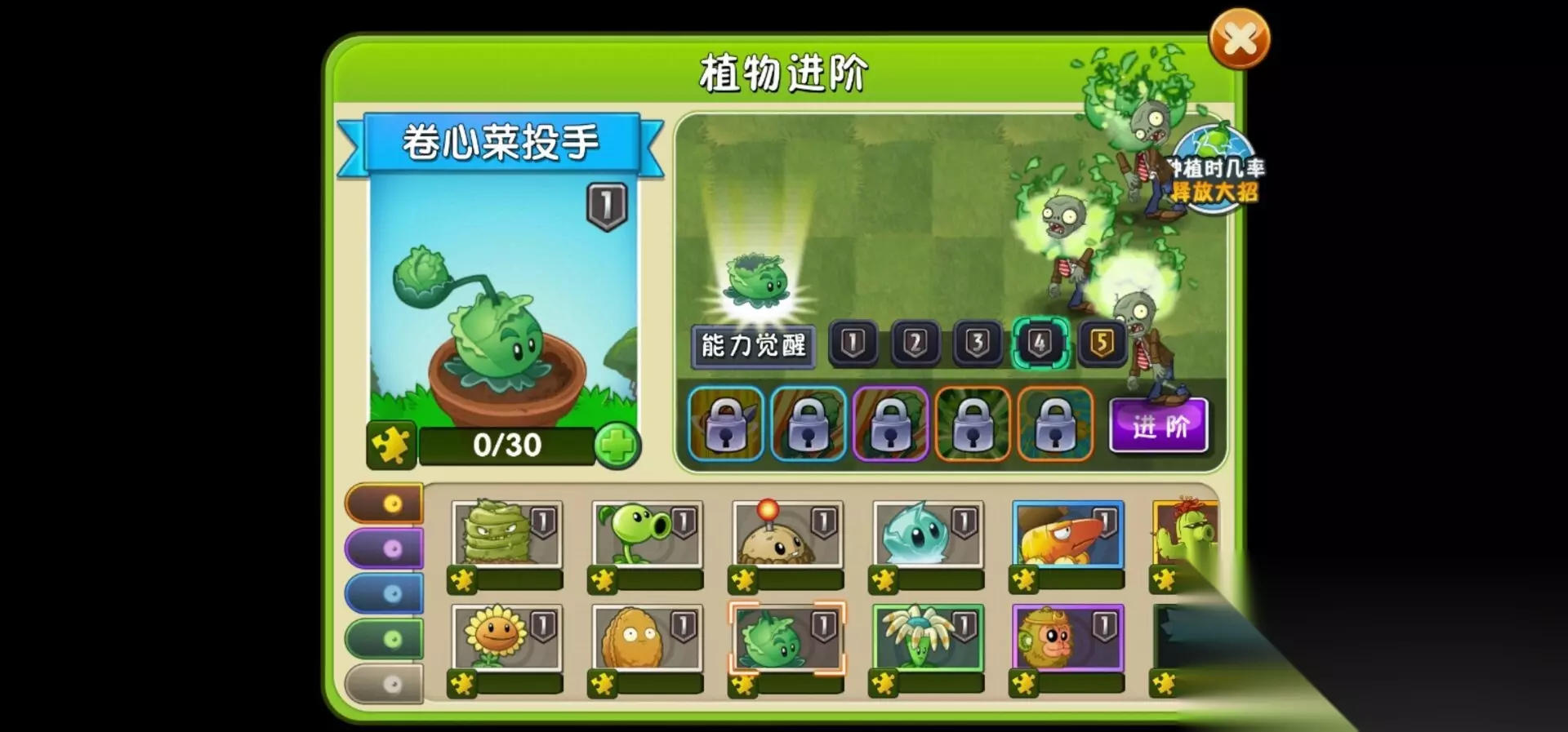 5、卷心菜投手,向前方僵尸抛出卷心菜造成伤害,种植需要花费100阳光,技能效果为抛出大量卷心菜对僵尸造成伤害。