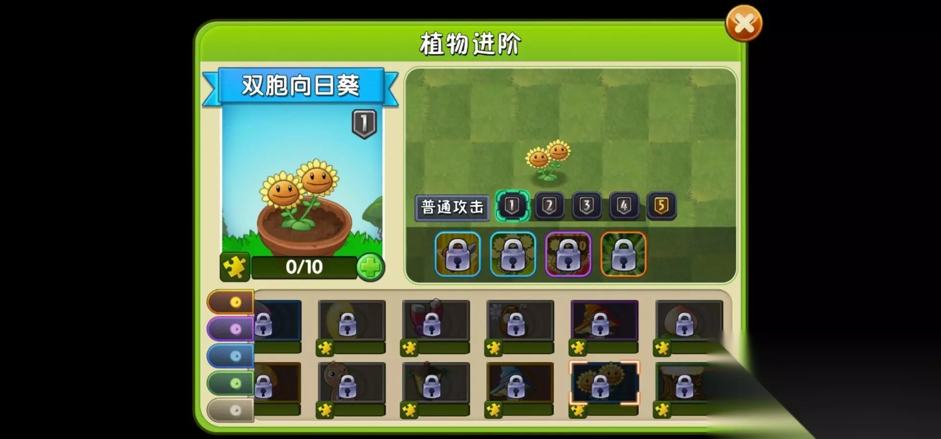 15、双胞向日葵,可以双倍的产出太阳,种植需要花费225阳光,技能效果为产出双倍的太阳。
