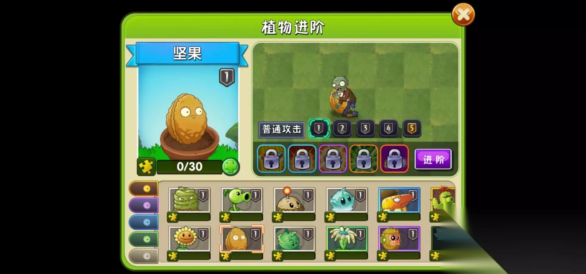3、坚果,坚果可以抵御僵尸,有着高防御性,种植要50阳光,技能效果为披上铁盔甲,抵挡更多的伤害。