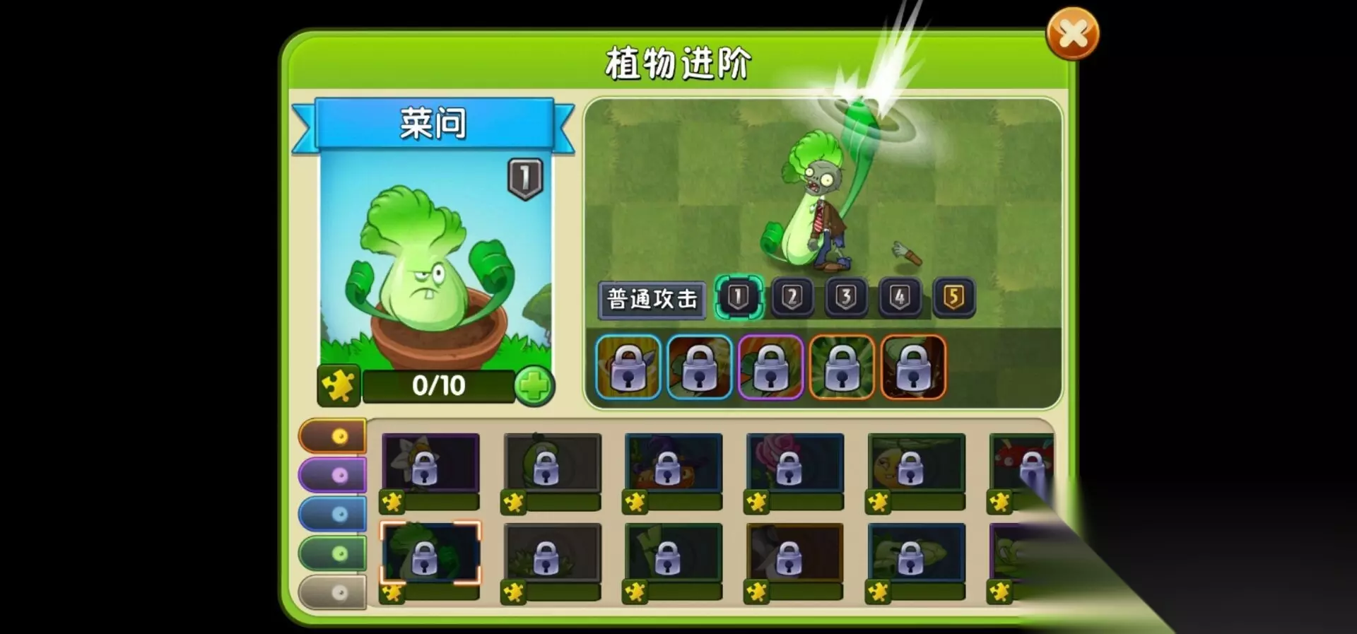 9、菜问,能够快速的击打前后的僵尸,种植需要150阳光,技能效果为对自身周围僵尸造成大量伤害。