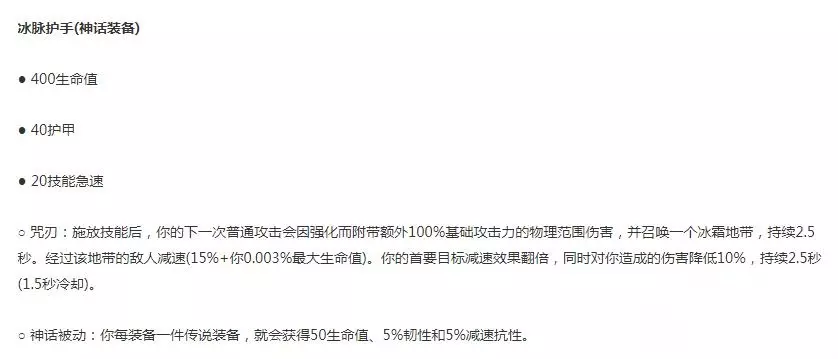 《英雄联盟》S13季前赛冰脉护手装备介绍 需要注意的是,以下数据为PBE测试服数据,正式服可能有所改动,敬请注意。 冰脉护手 装备等级:神话 400生命值 40护甲 20技能急速 咒刃:施放技能后,你的下一次普通攻击会因强化而附带额外100%基础攻击力的物理范围伤害,并召唤一个冰霜地带,持续2.5秒。 经过该地带的敌人减速(15%+你0.003%最大生命值)。你的首要目标减速效果翻倍,同时对你造成的伤害降低10%,持续2.5秒(1.5秒冷却)。 神话被动:你每装备一件传说装备,就会获得50生命值、5%韧性和5%减速抗性。