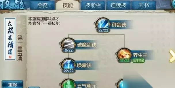 青云第一重技能玉清阶段的加点应以破魔剑诀和唤雷诀为主,两者分别提供高额单体伤害与定身控制效果。养生主作为被动暴击增益技能必须点满,而五气朝元仅适合自爆流玩法。第二重上清阶段需优先加满霜寒雪舞和盛冰之寒,前者具备群体减速与打断效果,后者能造成长时间范围定身,真元华闪则是对高血量目标的斩杀利器。第三重太清阶段重点强化剑心通明、天尊法身等被动增益,大招在七劫斩龙决与神剑御雷真诀间根据战斗场景选择。