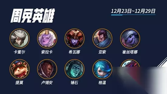 英雄联盟手游本周限免英雄有哪些?在英雄联盟手游中,每周都会有限免英雄为各位小伙伴们提供免费试玩的机会,就在本周也不例外,相信还有很多小伙伴们不清楚本周限免英雄有哪些吧,那么下面就由软件园小编来为各位小伙伴们介绍一下英雄联盟手游本周限免英雄都有哪些吧,还不清楚的小伙伴们一起来看一下,可别错过了哟。 本周限免英雄介绍 本次限免的时间为12月23日-12月29日,索拉卡、亚索、提莫、格温、锤石、永恩、崔丝塔娜等英雄加入周免。