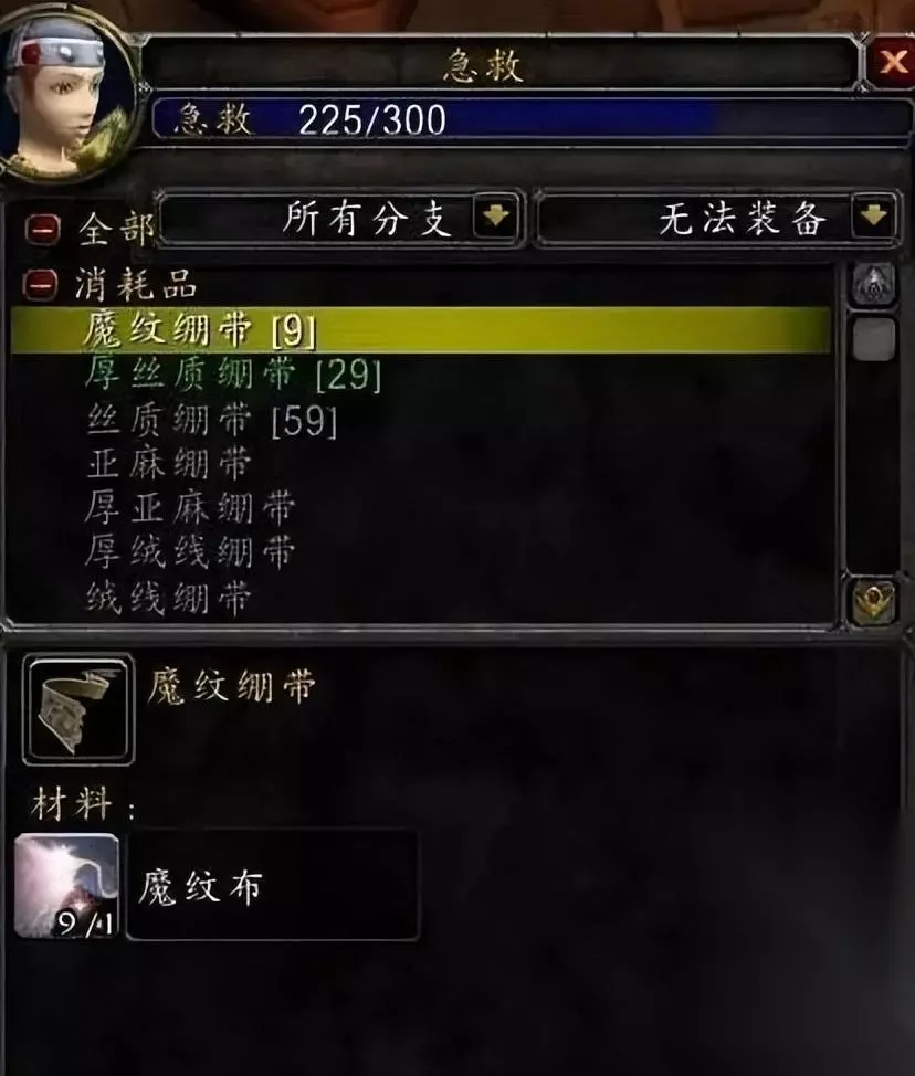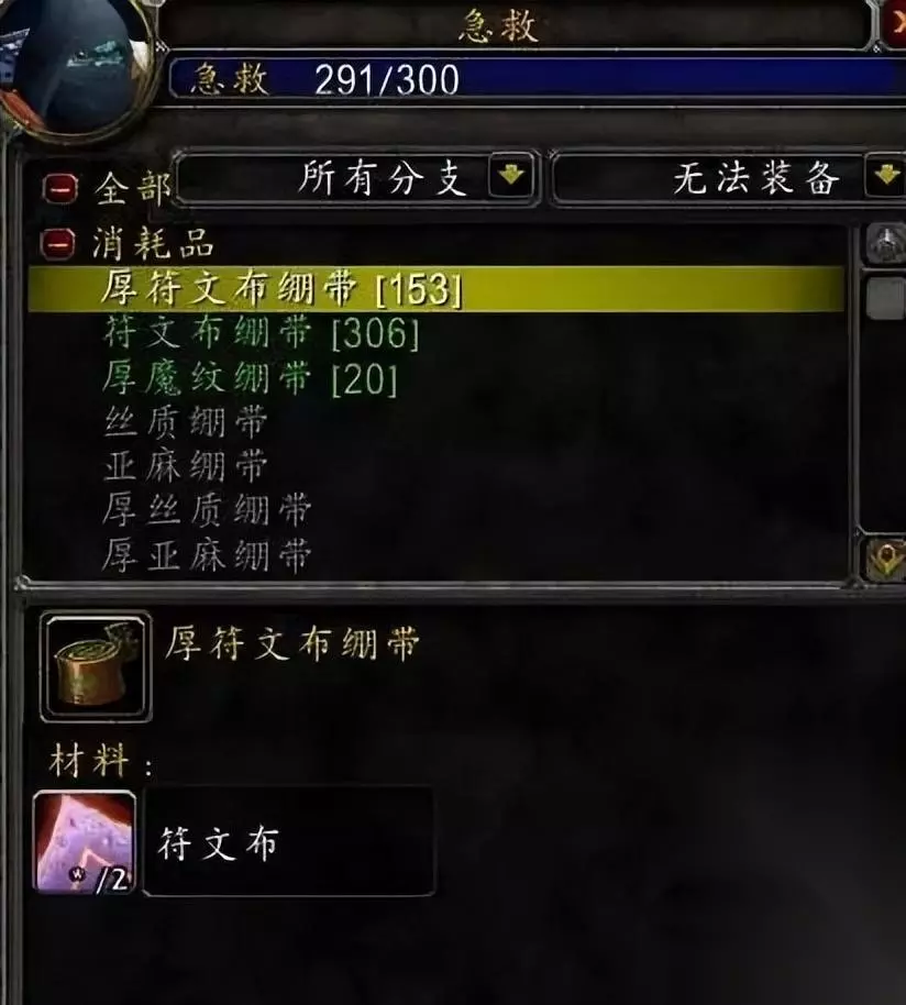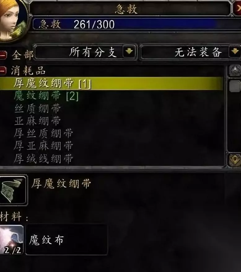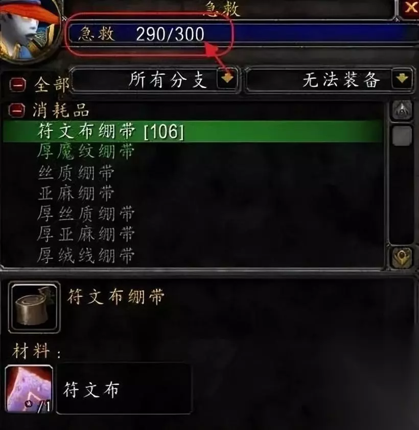 2、240-270级 制作厚魔纹绷带(材料为魔纹布*2),厚魔纹布绷带可以去找尘泥沼泽蕨墙村找商人买书学习,或者去激流堡里面左边找商人买书,懒得跑的话就在拍卖行买书也可以。