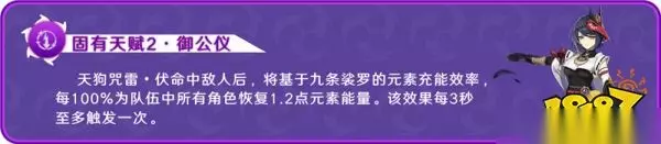 「乌羽」触发后的范围伤害命中敌人后,根据九条裟罗的元素充能效率给与全队一定的元素能量,每100%提供1.2点能量,给到的是全队的收益,但是量相对少。