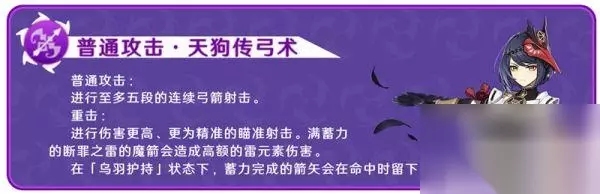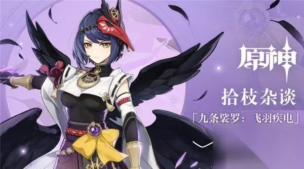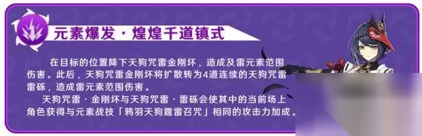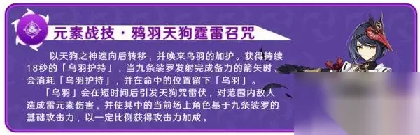 发动技能后向后位移,并获得18S的乌羽护持(九条右手上面缠绕的紫色Buff)。期间蓄力攻击将在命中的位置留下「乌羽」,「乌羽」会在短时间后引发天狗咒雷伏爆炸,造成雷元素范围伤害,并给当前场上角色基于九条裟罗的基础攻击力(人物自身攻击和武器基础攻击),以一定比例获得攻击力加成,技能冷却10S,攻击力加成持续时间为6S。