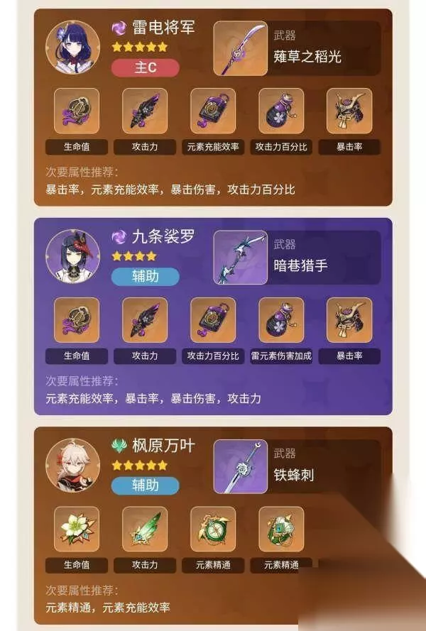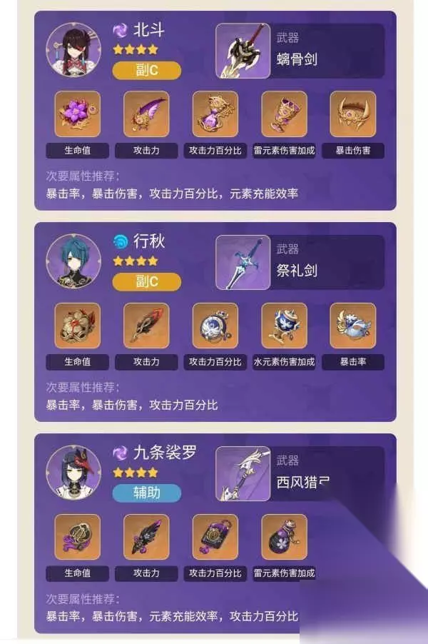 九条配队方面,单纯说从增加攻击力的角度去说的话,她和班尼特有的一拼,但是从辅助的功能性来说的话,班尼特可以占据加攻和奶的功能,所以她的加攻击力配合6命加暴伤,给雷系输出辅助,还是优秀的存在,所以还是考虑双雷的配队,而且更推荐有2命之后培养,不然速切的时候要考虑射一箭重击箭多少有点拖节奏。 以上是原神九条裟罗前期圣遗物的详细内容,希望这篇文章能给各位朋友带来启发和帮助,如果您还有其他相关问题需要解决,请继续关注本站,我们将为您提供更多所需的更新内容。
