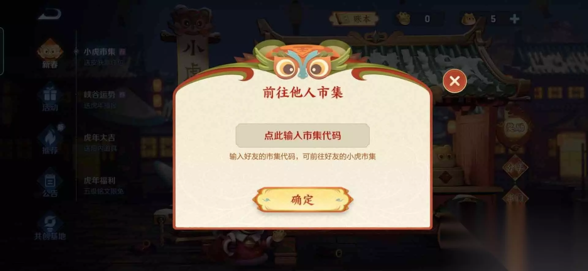 代码使用方法 在小虎市集右下角找到“串门”,输入代码,前往其他玩家的市集。 【小编推荐】专区入口 || 视频站入口 || 体验服申请入口 || 全民竞猜赢好礼 【新英雄爆料】| 司马懿 || 瑶 || 孙策 || 新英雄:囚徒/书圣/瞬 | 【新皮肤爆料】| 李白团战皮肤:敏锐之力new || 诸葛亮团战皮肤:掌控 || 典韦穷奇皮肤 Hot!! | 王者荣耀最新攻略 赛季段位继承表 每日一题 边境突围玩法攻略 体验服爆料