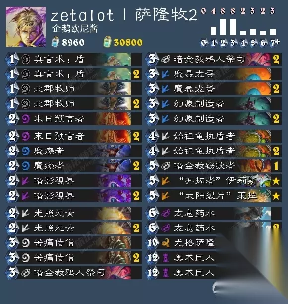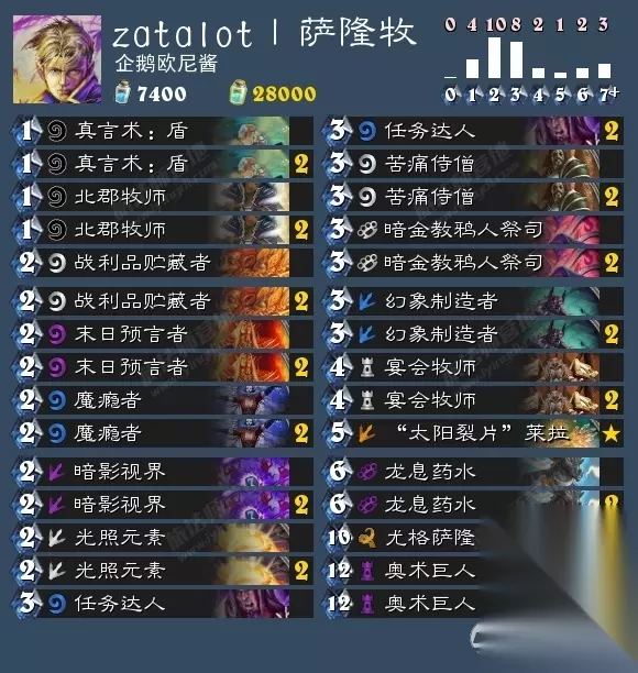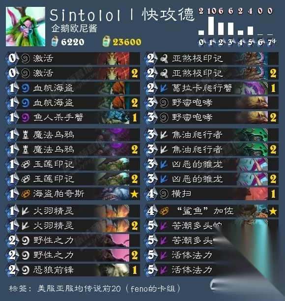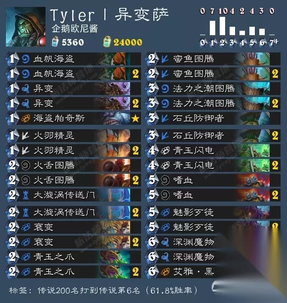 天梯强度:★★★★ 操作难度:★★ 娱乐效果:★★ 卡组讲解:这是一套铺场异变嗜血萨,魅影歹徒一般都是用来配合异变的,但是当场面需要小生物铺场时,也可以配合下回合的火舌或者嗜血来裸下。这套牌从1费开始就是各种铺场,带石丘防御者主要是为了中期过渡,其次打控制卡组时起手可以留下火舌,毕竟你的人多!