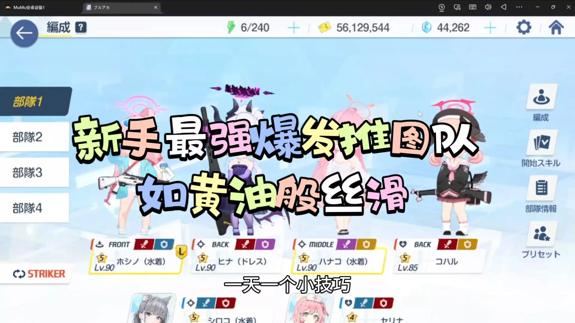 像这样好用的阵容其实还有很多,但这套是目前我玩的最舒服的一套,水花子的练度如果够的话一大一波小怪,最后靠日奈清场。