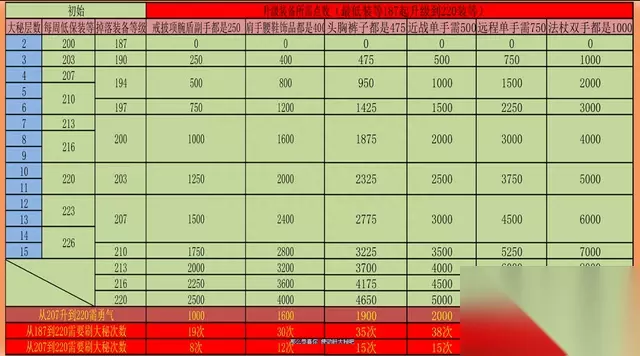为了看一下从最低级升到满需要多少勇气点数,这里我做了一张表格 ,抛开盟约任务的奖励不算 那么从207升级到220。最少需要4次 最多需要30次大秘。而如果按最低187开始到升满,最少需要19次 最多需要75次大秘。当然这个是最低值,一般现在的水平大家基本上都是至少从5层大秘打起,低保集中在210到220这个段,掉落集中在197到203这个段,那么实际上并不一定需要打这么多次大秘的。双手武器一类如果初始装等低于203一周内是无法升到满级的,如果你实在是脸黑,低层拿到了需要的或者属性合适的装备而高层却迟迟拿不到的话,那就只能准备好肝粮了。 另外上面的数据是升级一件装备的,如果你有多件装备需要升级,你可以详细算算你需要多少勇气。大秘境进场是需要钥石的,并不像普通5人本那样随便打,手里的钥石越打越高需要控制层数,单靠你手里的钥石并不效率。集合石上面的大佬职业鄙视链导致很多职业进不了组,现在低层刷勇气的队伍装等门槛已经提到220了,而且基本都组热门职业,加上GZS的疯狂控场,大秘境就又成了一块大蛋糕。