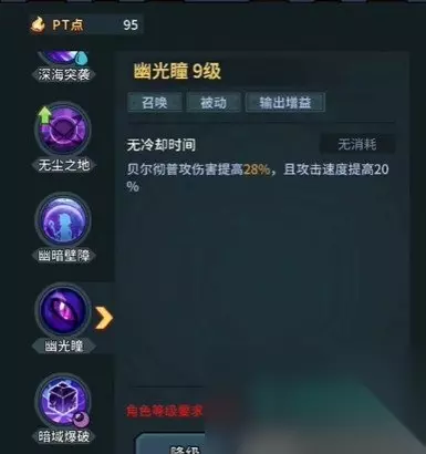 二、被动技能:幽光瞳 1、幽光瞳技能可以提高,海怪贝尔彻的普攻伤害 2、当贝尔彻的普攻伤害提高的同时,也可以提高攻速