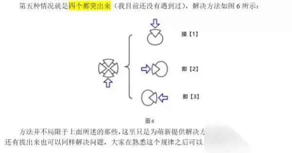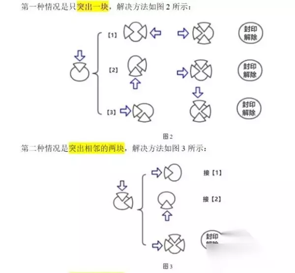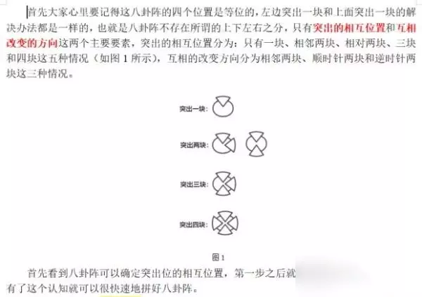 注意每个情况的第一步之后都有三个分支,第一个分支是影响相邻的两个模块,第二个分支是影响关系为顺时针两个模块,第三个分支是影响关系为逆时针两个模块。 对于下一步后八卦图的旋转也是一样的。只要知道机关之间互相影响的关系,解开封印就会变得很简单。 有个地方画错了。突出一块的第三种情况应该按下位于下方的那块。有个比较简单的记法,(相邻)两块按方向终点,三块按方向起点。懒得思考的用这个方法,手指跟着花两圈就解开了。