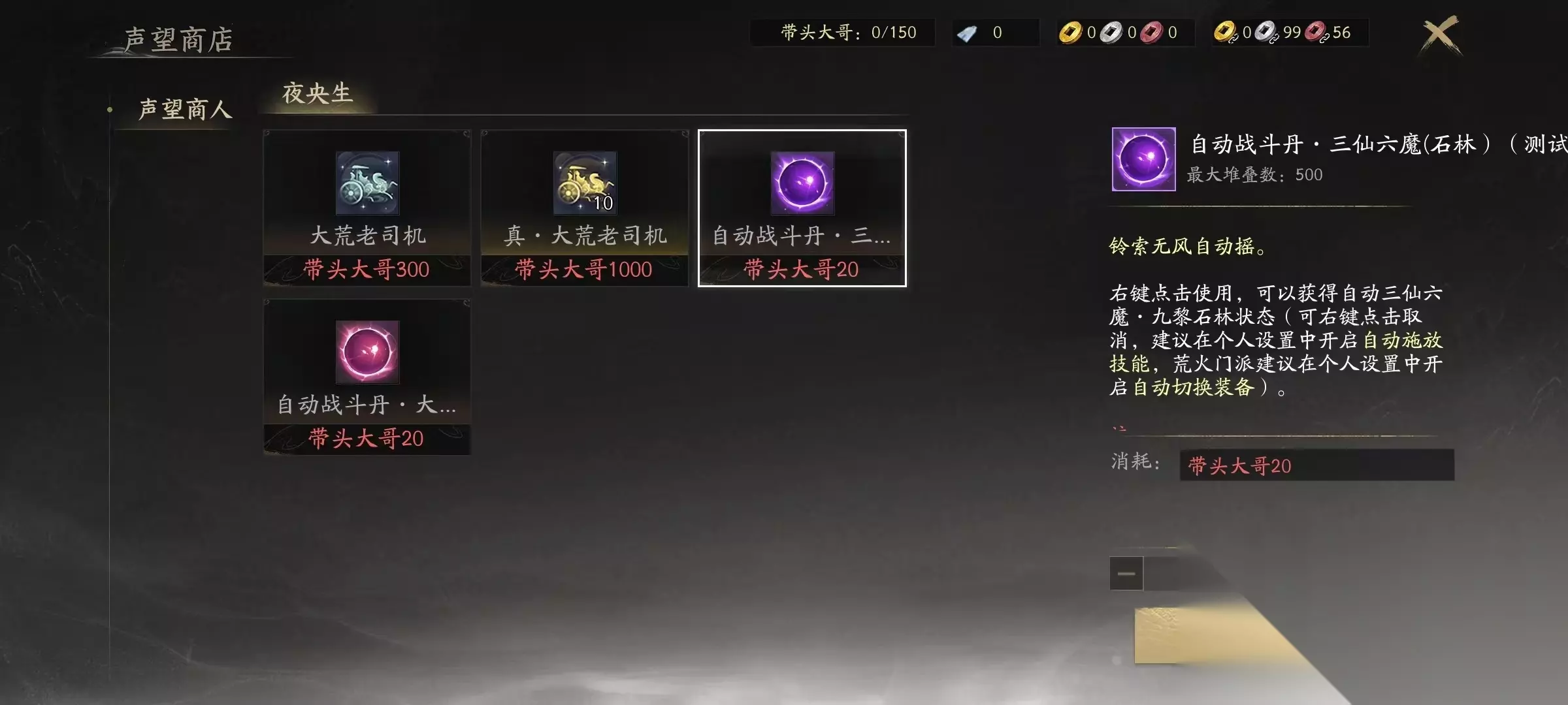 目前游戏共上线六类周常活动,所有任务均以自然周为周期,每周六上午8:00准时重置进度与次数上限。完成全部任务可领取对应声望、经验、技能点、稀有材料及专属称谓等奖励。具体包括:三仙六魔、大荒演武堂、祈福补天、王朝战备、藏金阁任务、皇陵探宝。 【三仙六魔】面向30级至80级玩家开放,每周最多挑战21轮。组队进入后需协同击杀指定区域刷新的精英怪物。该任务支持自动化流程:队长购买并右键使用“自动战斗丹”后即可全程托管。首次参与建议手动完成前几轮,以同步积累“带头大哥”声望,为后续声望兑换打下基础。