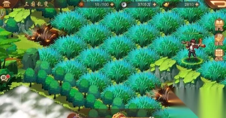 少年三国志2三国乱变攻略 第一、不是所有的草地都有怪,注意红框里面标注的草地,和普通草地有点不一样,看起来更“浓”一点,这种都要打过了,不然过不掉。 第二、除了草丛,还得把火烧的木材(应该是这种吧形容不上来),这个就很好认了,全部打完了才会出现桥,不然也是过不了的。 第三、打完会先通一条路,哪个路过去有曹操,过掉最后的桥(地)就会出来,这样就能顺利通过了。 如果玩家怕自己有遗漏的没打,也可以一排一排一个个走过去,到了尽头就转弯继续走,直到全部都走了遍,这种正常是不会有遗漏的。