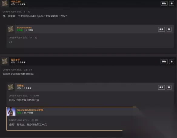有玩家期待是否能追加物理晃动效果,引发另一位玩家表示想去玩《剑星》;还有玩家提问蜘蛛是否可以有"浦西”,令作者反问"我可以试试...但怎么做",另一位玩家则提到可参考《魔物娘的同居日常》中阿剌克涅族的女性"拉克涅拉",无私分享自己的动漫心得。