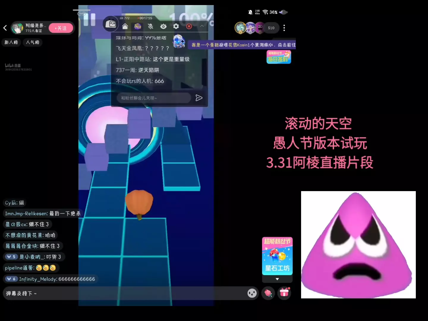 这是音乐游戏《滚动的天空》5.4.1愚人节版本更新介绍帖,介绍了“钻石工坊”“云人节”“月光剑客”等新关卡,还附上了游戏音乐专辑链接和下载链接,同时致谢了相关通关视频创作者。