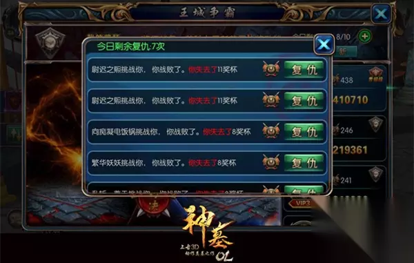 在《神墓OL》里,你不光能够从王城争霸的段位来知晓自己的能力,还能够通过1V1的比拼来获得海量金钱。你可不要小瞧了身边那些其貌不扬的人,他们之所以能够稳步攀升,绝大部分因素取决于战略。玩家可以将自己所学的技能升级来获得更大的杀伤力,比起普通攻击,利用各职业特定的必杀技能进行合理搭配,战斗取胜的几率也会相对大一些。 图3:可对曾经挑战失败的人进行“复仇”