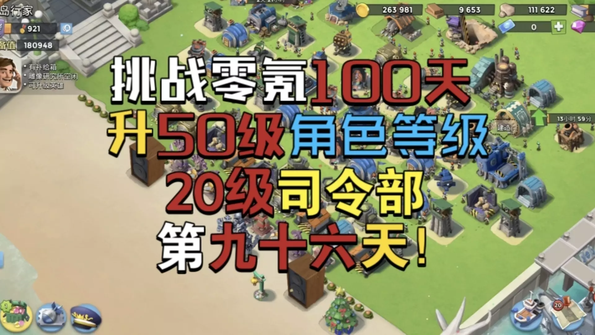 这是《海岛奇兵》零氪挑战的第91天,目标100天内将角色等级升至50级、司令部升至20级。当前展示了基地布局,还进行了建筑升级操作,领取了签到奖励寒冰护盾,分享了零氪升级的进度与操作细节。