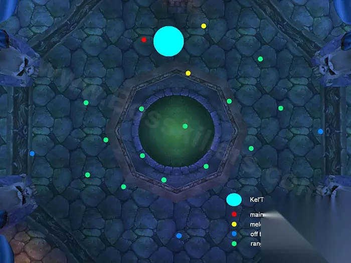 上图中青色大点是克尔苏加德,坦克在红点,黄点是近战组的集中位置,其余成员分散站立。 由于克尔苏加德的受打击范围很大,坦克和两个近战组三角形站在三个点上是最好的方式,最大限度减轻了冰霜爆震的威胁。注意,千万不要把冰霜爆震传染给坦克,4秒40k伤害可不好玩…… 不断的打断霜冻箭是这场战斗的关键,极大地减轻了坦克的治疗压力。普通难度下可能需要一个事先安排的打断循环,英雄难度下由于你有充足的人手,不必太刻意安排,让他们自己调谐即可。不过,最好还是安排两个人专职打断,好让其余成员安心地全力输出。 其余所有的远程职业,各自找好地点开始输出,记住互相离开10码以上!若脚下出现暗影裂缝,立刻跑开,但是请看好你跑的那个方向上是否正好有被施展引爆魔力的成员! 治疗方面,保证坦克存活的基础上治疗全团,应该不会是太困难的事情。 细节战略 普通难度:一个治疗看护坦克。如果打断协调不好,就安排两个。其余的治疗看护全团的状况。空闲出的副坦克,如果克尔苏加德身边的三角位已经满员,那你大可站在一边看戏直到下一阶段的开始。毕竟让冰霜爆震多连一个人对治疗是很大的负担。 英雄难度:这一阶段中,看护坦克的治疗是两个,若打断协调不好则是三个。安排一两个治疗快速反应任何被冰霜爆震击中的成员,牧师的盾非常管用。空余的副坦克可以站在人群中,一减轻治疗压力,二可以快速反应被克尔苏加德控制的玩家。控制职业要密切关注克尔苏加德之链,如果发生,第一时间控制住被控制的玩家。 当克尔苏加德的HP掉到45%时,第三阶段,也是最后的阶段开始。 职业小结 近战:保持打断,不要错过任何霜冻箭。此外,英雄难度下三角点上势必站3个或更多的人,不要害怕…… 远程:保持输出的情况下,随时关注暗影裂缝,团队随时处于运动中。 治疗:保持住自己看护的范围内的团队成员,此外,如果有插件,可以借助插件快速定位并治疗受到冰霜爆震效果的成员。 坦克:如果不是主坦克,也许呆在一边看戏是更好的选择,虽然乏味,但可以确保团队的安全。 挣扎 当克尔苏加德的HP掉下45%时他会向巫妖王求救,过几秒后从周围的入口处会冲进2/4名冰霜皇冠卫士。他们不是一起冲出来的,而是每5-8秒随机从某个门中杀出一个。这些卫士的HP非常高,无法被控制和风筝,但是会在克尔苏加德倒下后撤退。 卫士出现后,每经过15秒,攻击力就会提高15%,因此这一阶段事实上有一个软狂暴计时,团队必须在卫士的攻击力变得无法控制之前结束战斗。 基本和第二阶段一样,只是多了卫士。