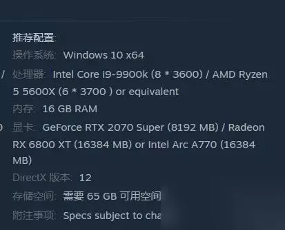 推荐配置要求: 操作系统: Win 11 处理器: Intel Core i9-9900k (8 * 3600) 或 AMD Ryzen 5 5600X (6 * 3700 ) 或其它同等配置 内存: 16 GB RAM 显卡: GeForce RTX 2070 Super (8192 MB) 或 Radeon RX 6800 XT (16384 MB) DirectX 版本: 12 存储空间: 需要 65 GB 可用空间 ps:幽灵行者2将登陆PS5、XSX|S和PC的Steam、Epic、GOG平台。