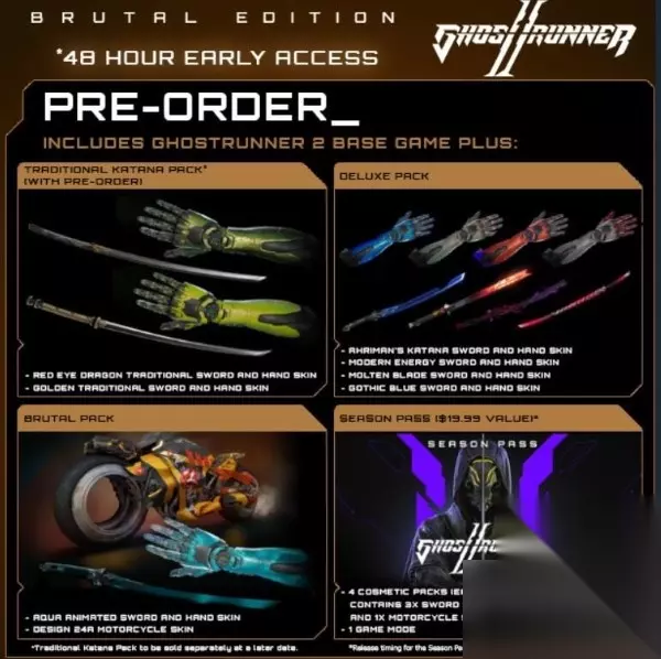 残暴版248元预购奖励 提前2天解锁游戏 幽灵行者2本体 红龙及其手部皮肤 金刃及其手部皮肤 阿里曼的武士刀及其手部皮肤 现代能量剑及其手部皮肤 炽刃之剑及其手部皮肤 哥特蓝刃及其手部皮肤 带玩家昵称的手部全息投影仪 水流动态剑刃及其手部皮肤 Design 24A 摩托车皮肤 幽灵行者2季票
