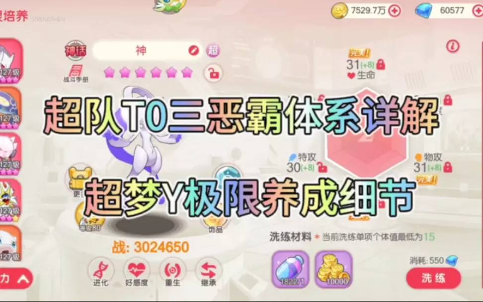 超梦Y养成详解跳转9分17秒。前面有一处错误,推荐雪拉比和起源梦幻拉到8星不是Z8