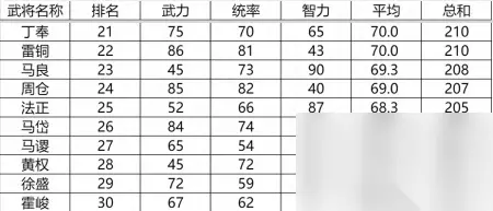 这四位的实战价值就更高了。 作为原创的两位武将——藩宫和李明,两人分别是个加入的武术家和猛兽使,这两个职业早期成长快,也正好让他俩在早期可以成为刘备军中的中坚力量。当然,到了中后期随着主力兵种的成长上升,以及更厉害的魏延加入,这两位一般会渐渐淡出我军的主力阵容。 而刘辟作为早期最厉害的山贼,登场也不算晚,想练的话比刘封要容易的多。 的沙摩柯登场虽晚,但是武力的确是高,加上异民族的属性成长奇高。所以如果大家愿意耐心培养的话,还真是可以发挥一些奇效。 当然,以上说的都是一些另类而非打法,如果想认真打出效果,那么15人还是从剩下三个档次里选比较好。 3 排名21~30的武将:平均属性65~70点之间,鸡肋,和上一个档次一样,除了特定的几个人外,其他的也都是属性还不错,但是实际登场中,能排他前面的大有人在。