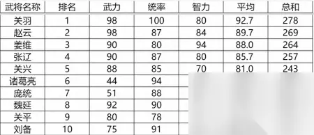 这个没啥可说的了吧。刘关张三兄弟,除了刘备外登场时间最长的主力大将。除了智力不达标,其他属性反而都还可以。 虽然用起来比关羽赵云差了一个等级,但是张飞依然是近卫队妥妥前五之一。决战是必然腰上的。 5 排名1~10的武将:平均属性75点以上,能在这里的基本都是核心主力。当然,也有几位相对悲催的存在。