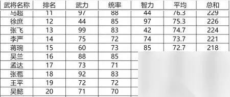 这三位武将别看属性没进前二十,却是三个职业原生。 马良是运输队,马谡是军乐团,周仓则是盗贼。 这三位,尤其是前两位基本上就是必然会出现在我军主力阵容之中的,没有其他选择。除非你把庞统或者诸葛亮转化为运输队或者军乐团。否则不会有比他们俩更合适的人选。 而周仓作为盗贼,虽然登场的时间没有那么多,但是也可以在前期好好培养一下,决战带上他不是不可以。 4 排名11~20的武将:平均属性70~75点之间,大多数都可以当作主力来使用。当然,其中也有不少因为登场少或者有更厉害的人从而只能是昙花一现。