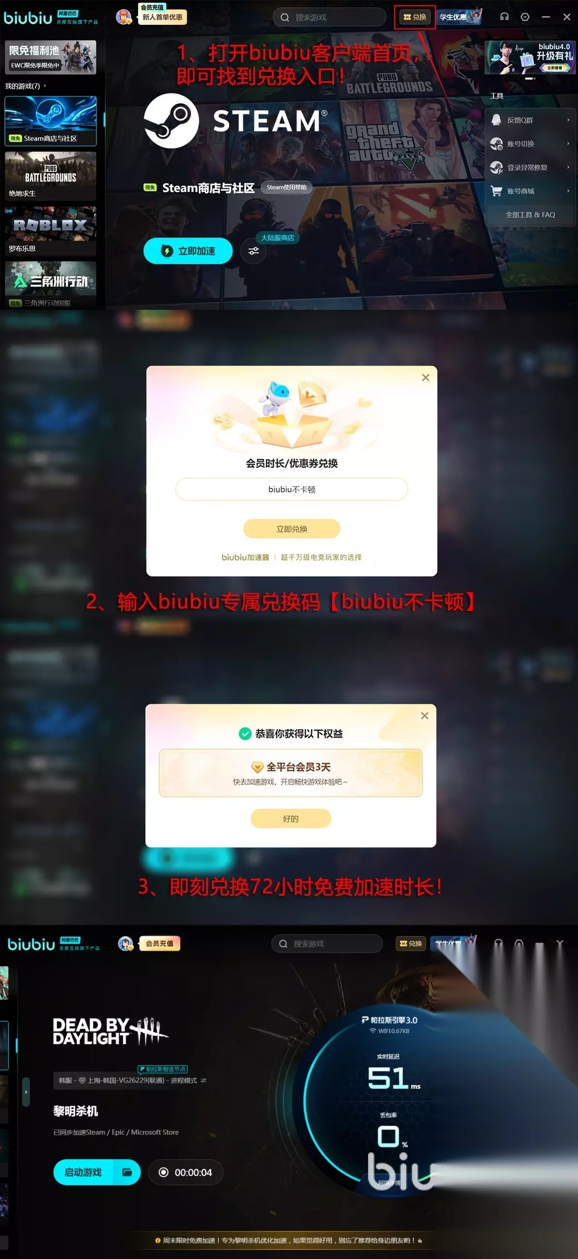biubiu还推出了很多福利活动,输入【biubiu不卡顿】的兑换码,新老用户直接领72小时的免费加速时间,而首次注册再送24小时,新人叠加起来有96小时免费畅玩,飞头追人丝滑到起飞!