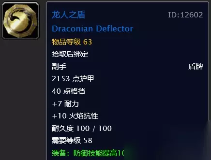比斯巨兽掉落的一把小刀,论战斗性可能它就是个废物吧,实用性真的是满分。学剥皮的小伙伴肯定都遇到过“需要剥皮技能305″类似这样的提示,当时心里就只有MMP,剥皮技能最高300,你他喵的需要305,暴雪你是不是智障,直到发现有这把剥皮刀,才发现原来是这样玩的(当时网络信息没有现在这么发达相对比较闭塞,很难网上去了解这些信息,也有可能我当时比较蠢,哈哈哈)。有了它我们才能剥一些比较珍贵的皮,最主要的是可以剥黑龙MM奥妮克希亚的皮,黑龙MM的皮可以做一件叫做奥妮克希亚鳞片披风,这件披风是咱们干黑翼关底BOSS奈法利安的必备装备。 第二件 龙人之盾
