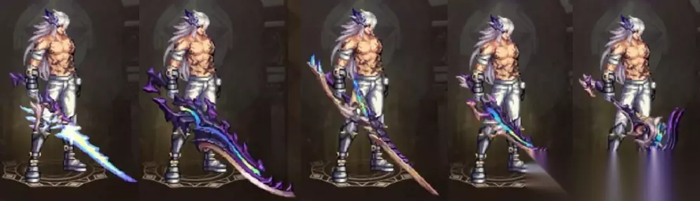 属性如何这里先不说,主要看一下全职业武器外观。首先是鬼剑士的5把武器,从左到右分别为光剑、巨剑、太刀、短剑、以及钝器。