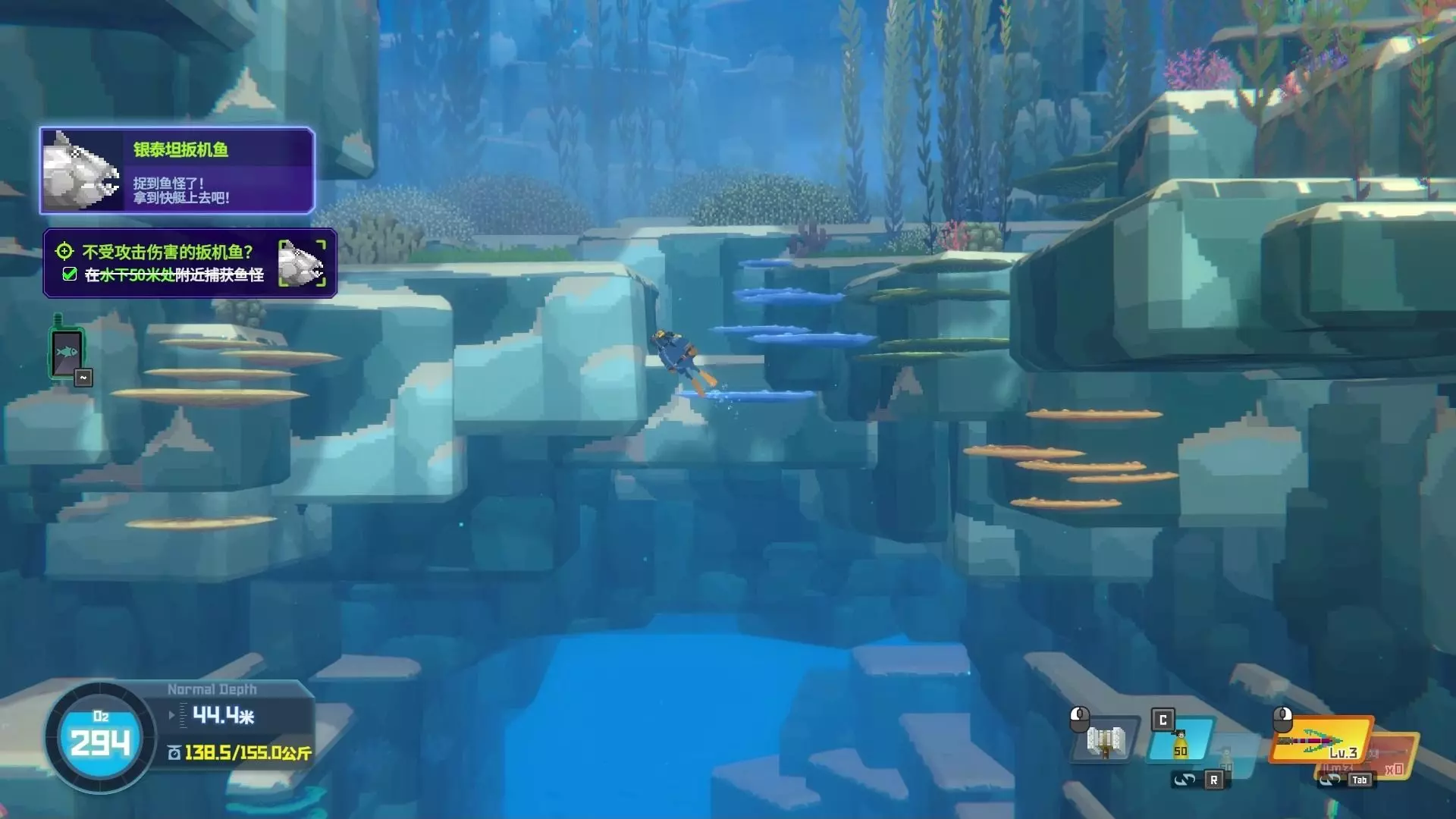 这是游戏《潜水员戴夫》的内容分享,展示了游戏内的装备、任务界面,还呈现了使用特殊武器攻击的场景,提及可用雷神之锤、雷电矛对战最终boss,同时展示了当前的任务进度与获得的各类鱼肉道具。