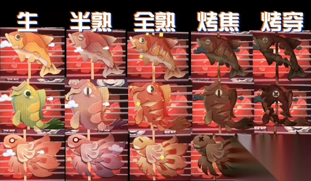如何判断生熟: 生鱼=直接完成烤制 半熟=一次变色 全熟=二次变色 烤焦=三次变色,表面发黑 烤穿=鱼肉烤穿