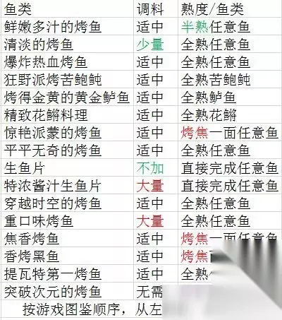 全图鉴烤鱼烤制方式: 少量调料+烤熟任意鱼=清淡的烤鱼 适量调料+半熟任意鱼=鲜嫩多汁的烤鱼 全熟苦炮鲀不加调料=狂野派烤苦炮鲀 全熟鲈鱼不加调料=烤的金黄的鲈鱼 全熟花鳉不加调料=精致的花鳉料理 以上三种随机出平平无奇的烤鱼/穿越时空的烤鱼/提瓦特第一烤鱼/爆炸热血烤鱼,会优先解锁图鉴 烤焦一面任意鱼(不翻面就行)=焦香烤鱼/惊艳派蒙烤鱼(刚刚冒烟立刻点完成) 烤焦两面任意鱼=香烤黑鱼 大量调料+直接完成=特浓酱汁生鱼片 烤焦不加调料=重口味烤鱼 不加料直接完成=生鱼片 烤穿任意鱼=突破次元的烤鱼