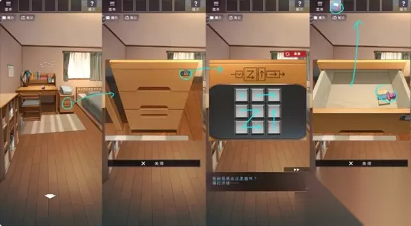 关卡7 回到卧室,依照提示打开抽屉,取得里面的信纸与线轴,并使用信纸写好信(选中信纸点击桌面上的笔)。
