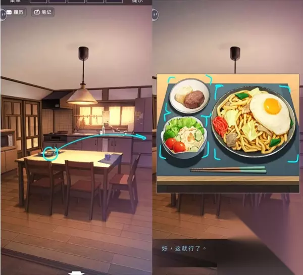 将炒面和凉菜放在桌面上,吃完后点击左上角的牡丹饼,给幽灵就能过关。