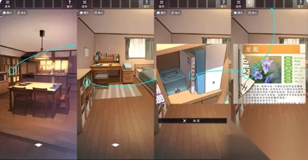 关卡3 回到家后,通过微波炉旁边的门进入卧室,从旁边的书架上拿到植物图鉴,翻到龙胆页,取得碎片。