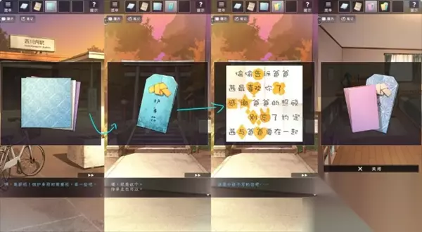 前往后山将福纸泡水得到图案,调查水中发光点得到储物柜钥匙,前往车站打开储物柜得到折纸。
