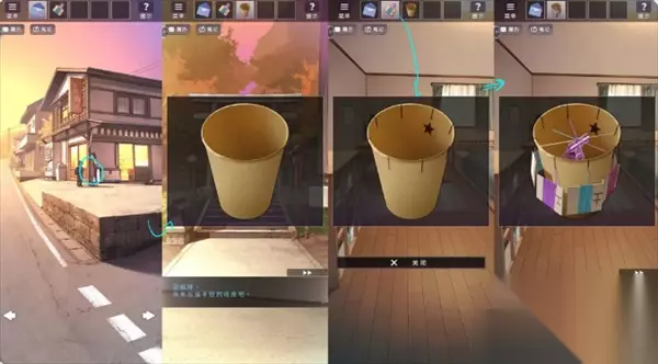 在街道与弟弟对话得到苦茶,将苦茶给幽灵得到空杯子,空杯子在书桌前使用得到剪好的纸杯,纸杯与线轴组合得到编织工具。