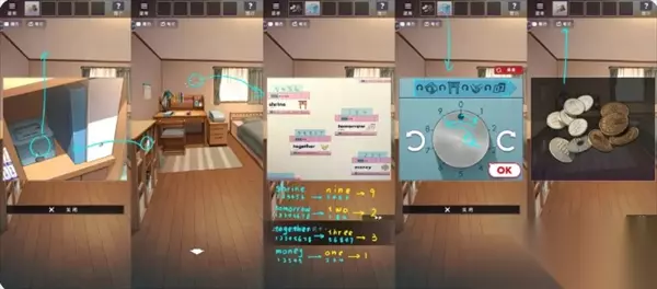 回到家在书架上取得存钱罐,依照墙上单词的提示打开存钱罐拿到零钱。