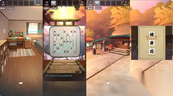关卡8 回到卧室,在桌面上取得手帕,打开后可发现上面有字;与幽灵对话得知“需要同时看正反两面”,前往后山将手帕泡水,显现出字。之后前往神社祈福,调整祈福为“彼岸花”,得到福纸。