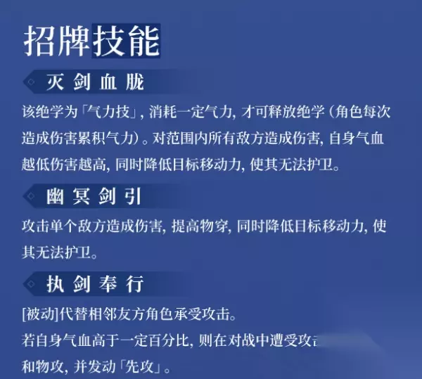 技能: 绝学 攻击单个敌人,造成1.4倍伤害,物穿提高10%,「对战前」驱散2个【有益状态】,施加「迟缓」状态,持续1回合。 「迟缓」:移动力降低1,无法护卫